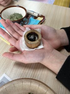 カシャカシャ、カサカサする乾燥したよもぎをすり鉢ですりつぶす。一回目の時より手つきがよくなり、作業も早い。すりつぶし、産毛(?)をとっていくとだんだんやわらかく、ふわふわになる。そしてヨモギの香りも感じる。その後「高擶はっか」も同じようにすり鉢ですりつぶすとにおいの違いをはっきり感じます。ミントよりより、大地を感じるにおい。「歯磨き粉のような・・・」と表現しながら作業をします。
