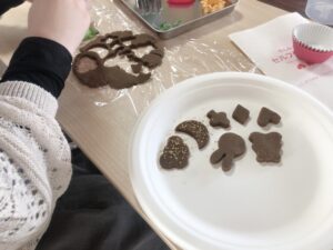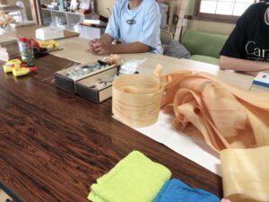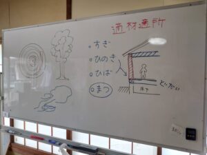 鉋屑を使った工作やタイル細工を体験したのち、家の歴史や木材についてなど