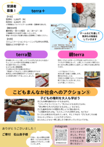 まずはスクール生の「やってみたい」がterraの中で少しでも多く実現していけるように、みんなで知恵を出し合いたいとおもいます