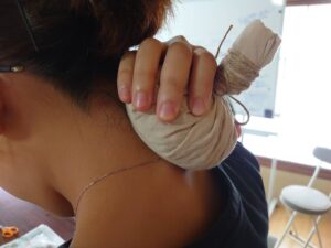 出来上がった後はレンジで少しあっためていろんなツボにあてて、香りと温かさに癒される時間でした。