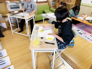 筆の使い方を体験した後は、好きな色で好きなもじを書いてみる。