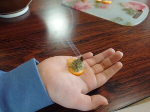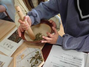 毎月恒例のプログラム、おきゅう。慣れた手つきでもぐさをする子供たち。