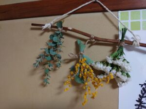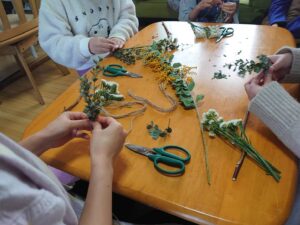 今月のお花はミモザ。生産者の方の話や、花材についての話など毎回作るだけではない素敵な学びです。