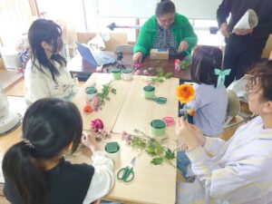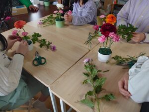 今回は生花のアレンジ!自分の自由に、切りたいように切り、オアシスにさしていきます。