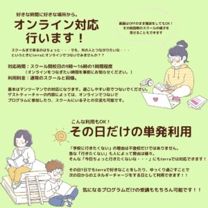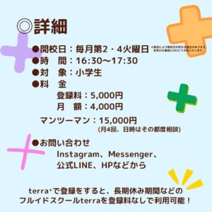 フルイドスクールterraのプログラムがリニューアル。これまでゲストティーチャーとして行っていた3つのプログラムは通常プログラムとして毎月開催。ほかに月1~2程度のゲストプログラムを導入予定です。子どもたちの豊かな体験、好奇心のドキドキワクワクを目指して計画しています。詳細は毎月のInstagramにてお知らせしていきます。